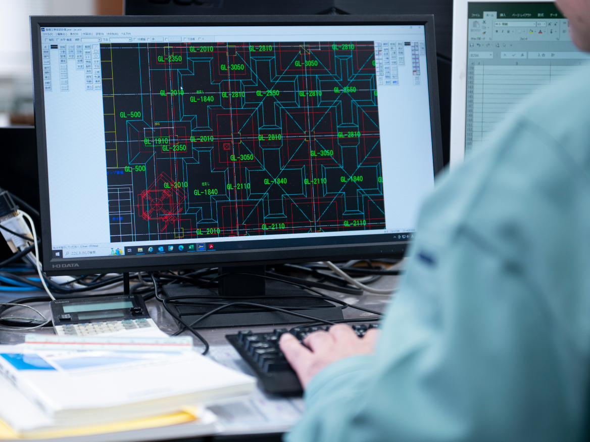 現場の地盤把握や周囲の環境などを調査し、現場の特情に合わせた計画・計算を行っています。あらゆる目的や状況に応じ、創業以来培ってきた、土木工事・基礎工事の施工管理ノウハウを生かして計画を組み立てています。